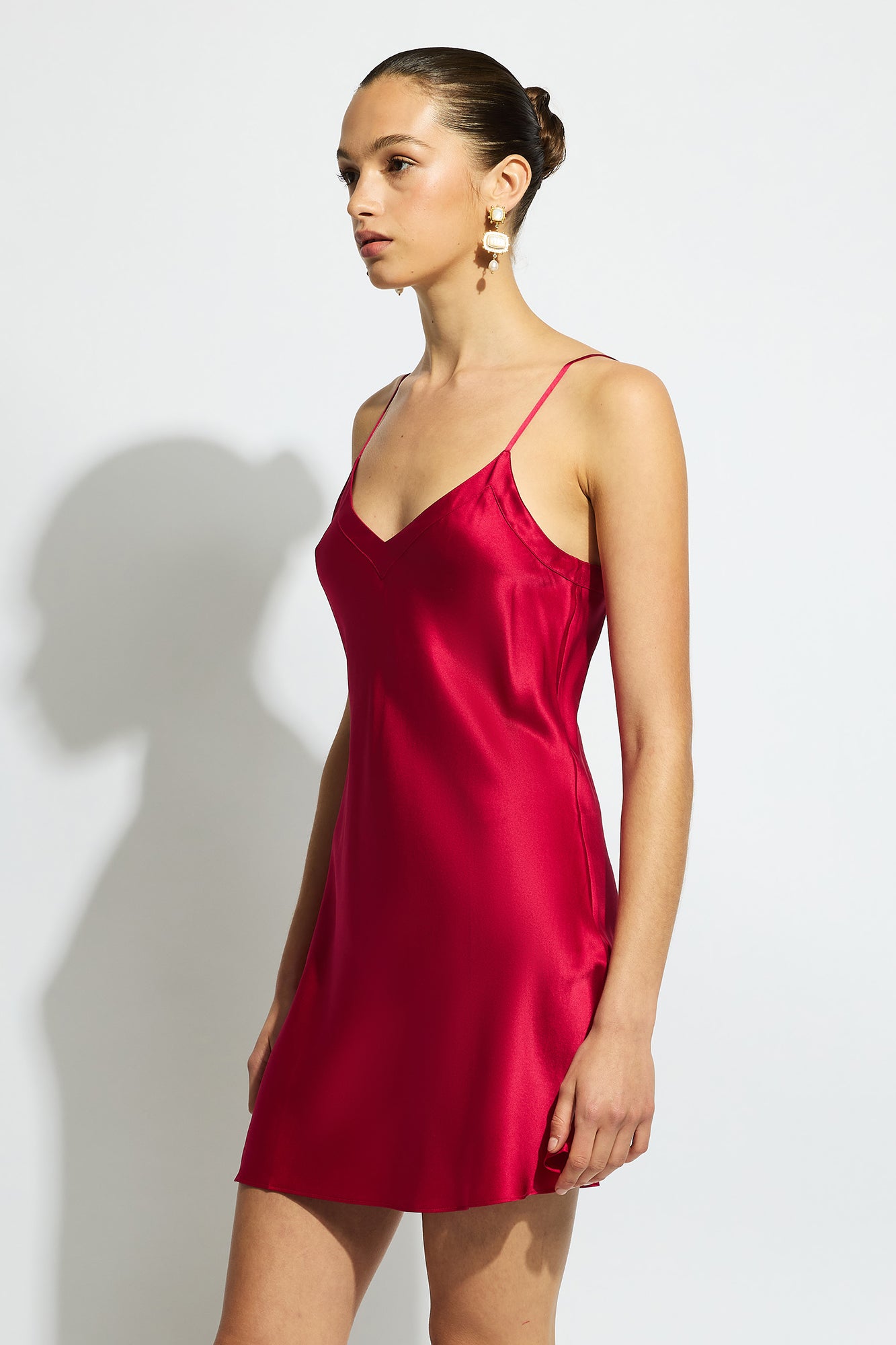 Crafted from delicate pure silk, this luxurious bias-cut chemise flatters the female figure with its v-neckline, detailed binding, and fine adjustable straps. The chemise falls into a mini length with a slightly fluted hem.