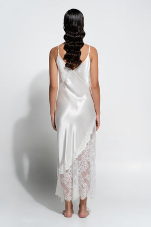 The Aurielle Slip is crafted from a luxurious silk cotton blend for an effortlessly lightweight feel against the skin. Falling to a flattering midi length that skims the mid-calf, this piece is elevated with asymmetrical lace detailing for a romantic touch. Finished with scalloped lace along the hemline, the Aurielle blends timeless femininity with contemporary ease - perfect for lounging or layering.