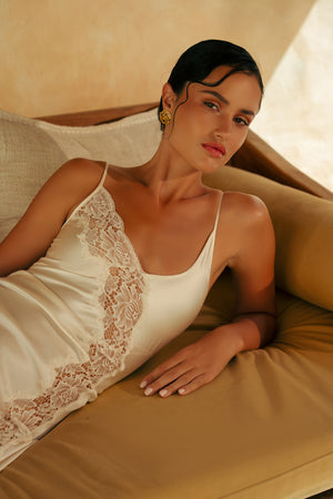 The Jezebel Chemise is crafted from a luxurious silk–cotton blend, offering an effortlessly lightweight and breathable feel against the skin. Designed to fall to a flattering mini length that softly skims the mid-thigh, it is finished with delicate asymmetrical lace detailing for a romantic, elevated touch. Blending timeless femininity with modern ease, the Jezebel Chemise is perfect for relaxed lounging or effortless layering.