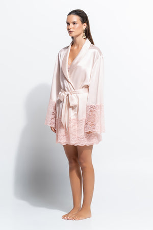 The Silk Lace Robe is an enduring romance, made in soft silk and detailed with delicate hand-cut lace to celebrate the female form. A cover-up robe that falls to the mid-thigh, trimmed with a decadent 8" lace. The neckline is finished with a shawl collar. Silk ribbon inserts to secure the robe on the inside and a silk belt secures around the waist.Silk Basics by GINIA are modern silk essentials for every day. A collection of beautifully curated pieces that work independently and in combination.