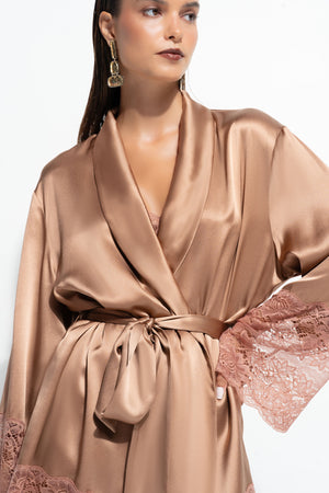 The Silk Lace Robe is an enduring romance, made in soft silk and detailed with delicate hand-cut lace to celebrate the female form. A cover-up robe that falls to the mid-thigh, trimmed with a decadent 8" lace. The neckline is finished with a shawl collar. Silk ribbon inserts to secure the robe on the inside and a silk belt secures around the waist.Silk Basics by GINIA are modern silk essentials for every day. A collection of beautifully curated pieces that work independently and in combination.